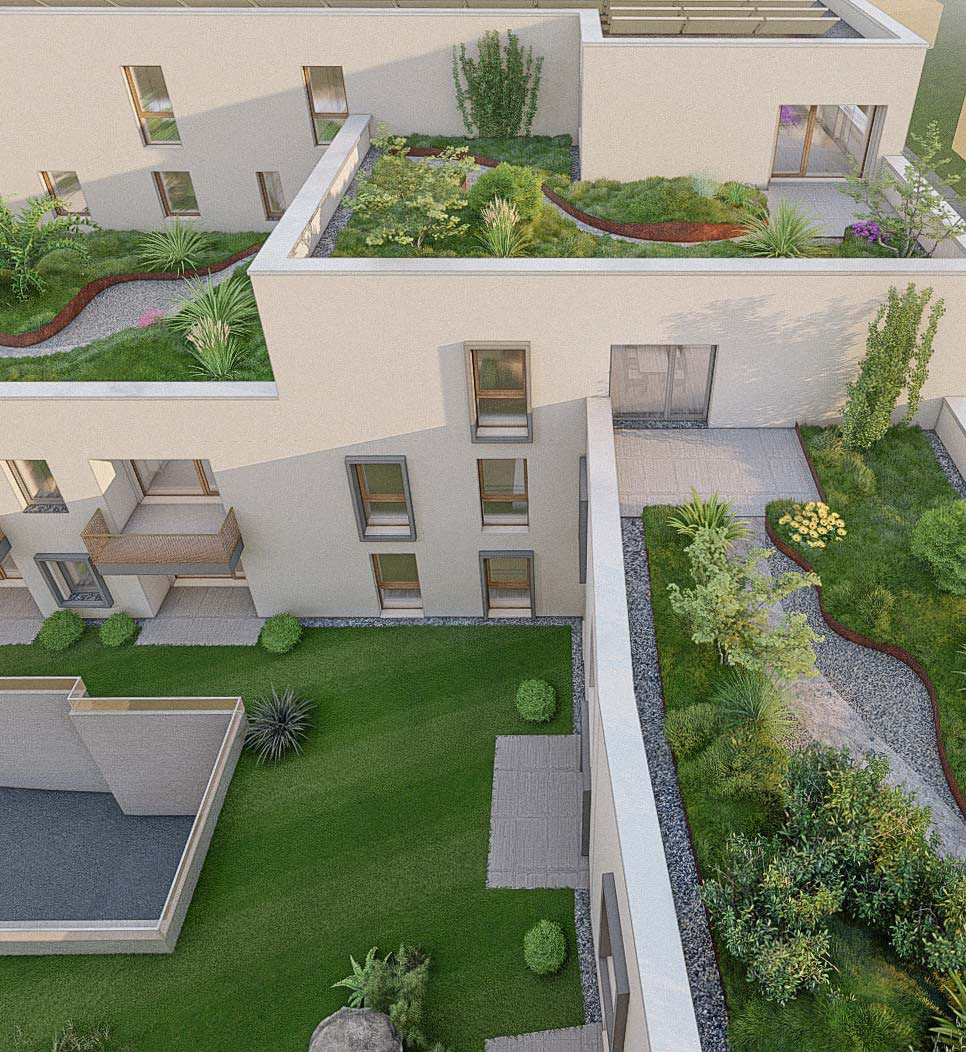 Die Terrassen sind über das gesamte Gebäude verteilt und bieten den Bewohnern nicht nur eine tolle Panorama auf die umliegende Landschaft, sondern auch einen Ort zum Entspannen, Essen und sozialen Austausch. Die Terrassen sind mit einer Vielzahl von Pflanzen und Bäumen bepflanzt, die nicht nur zur Schönheit des Gebäudes beitragen, sondern auch zur Verbesserung der Luftqualität und der Reduzierung von Lärm beitragen.