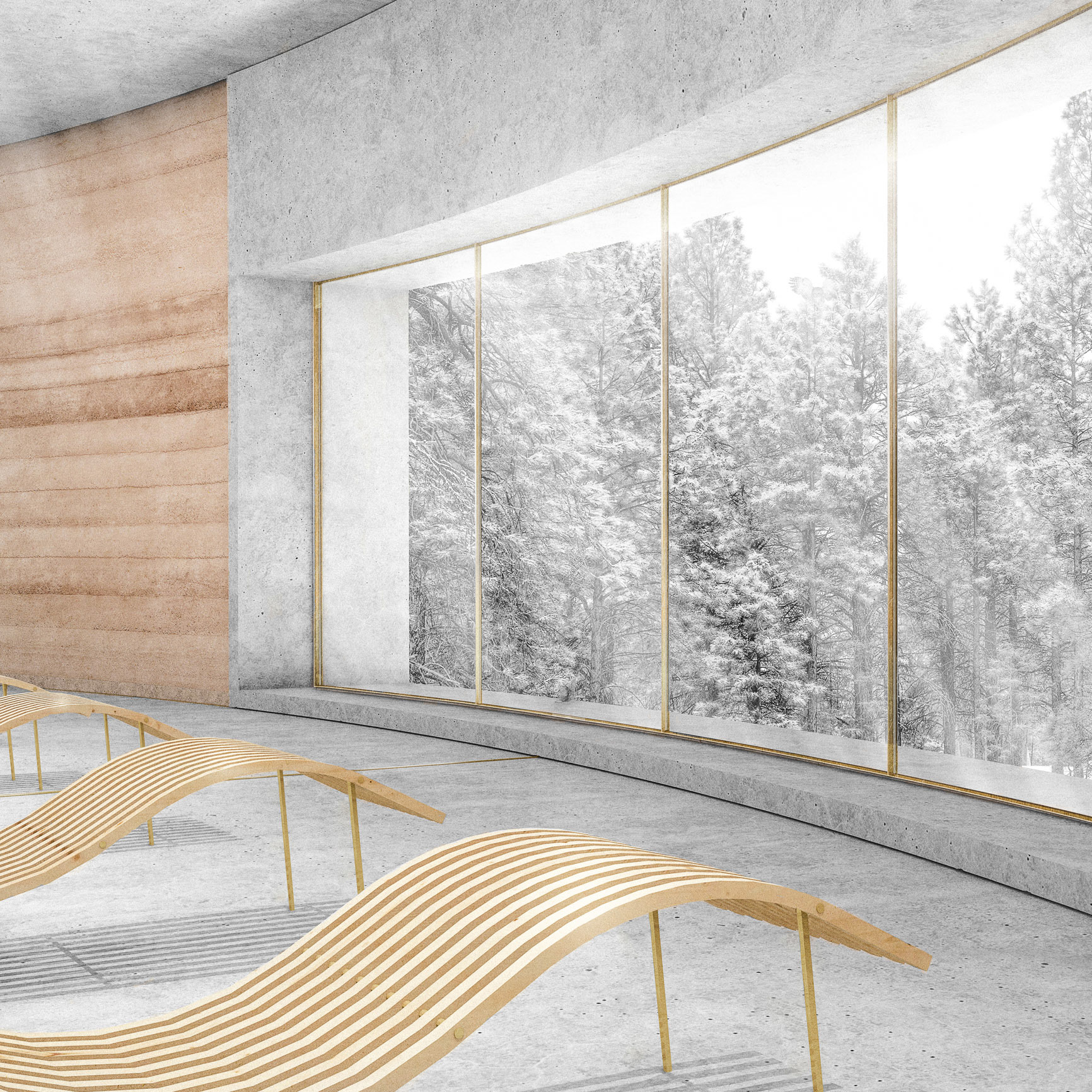 Nach dem Ritual der Reinigung öffnet sich das Badehaus zum ursprünglichen Kiefernwald. Es ist so, als ob man durch einen Bernstein nach draußen blickt. Das Badehaus scheint eine enge Verknüpfung mit der Natur und den geologischen Gegebenheiten der Region zu haben, ohne die amorphe Gestalt des Bernsteins aufzunehmen.